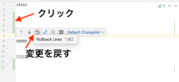 git管理下のファイルに変更を加えると、エディタの横に線が出てきます。ここをクリックすると下のようなメニューが出てきます。このメニューの「Rollback Lines」をクリックすると、変更された箇所をブランチの最新へ戻すことができます。
